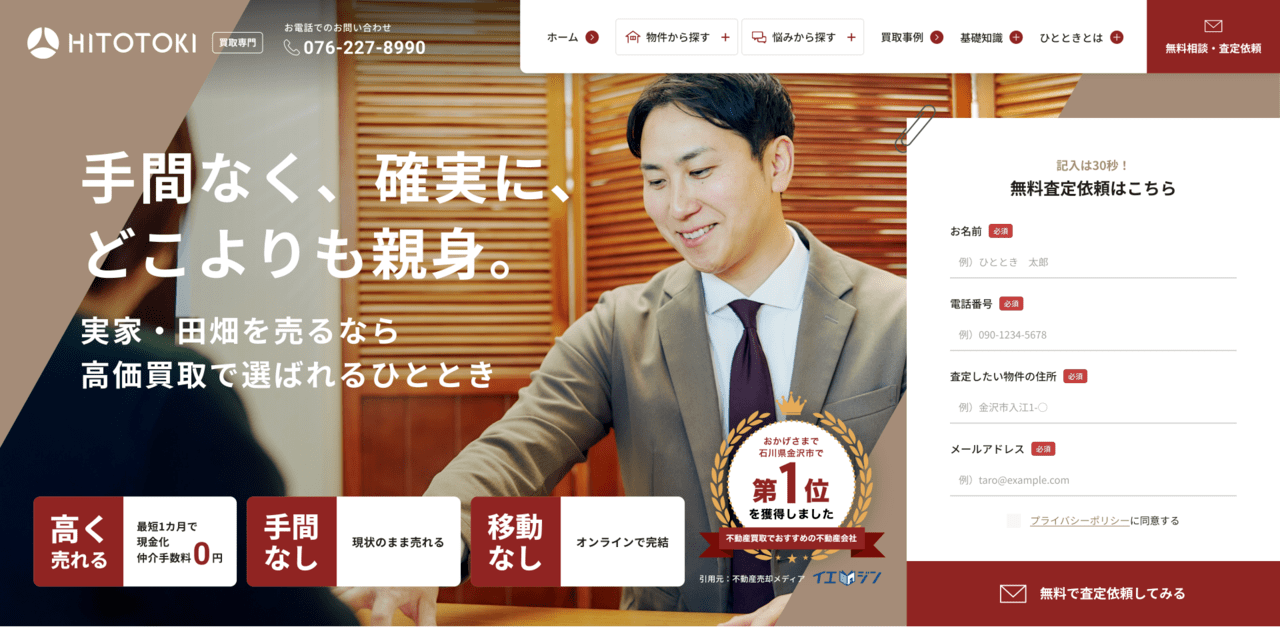 ひととき株式会社は、「高値・早さ・手間のなさ」のすべてを兼ね備えた、金沢市を代表する不動産買取会社です。地域の相場を熟知したスタッフが直接買取を行うため、仲介を挟まずに仲介手数料0円・最短1週間の現金化を実現。相続した実家や農地、老朽化した建物、他社で断られた訳あり物件など、あらゆる不動産に柔軟に対応できる点が高く評価されています。