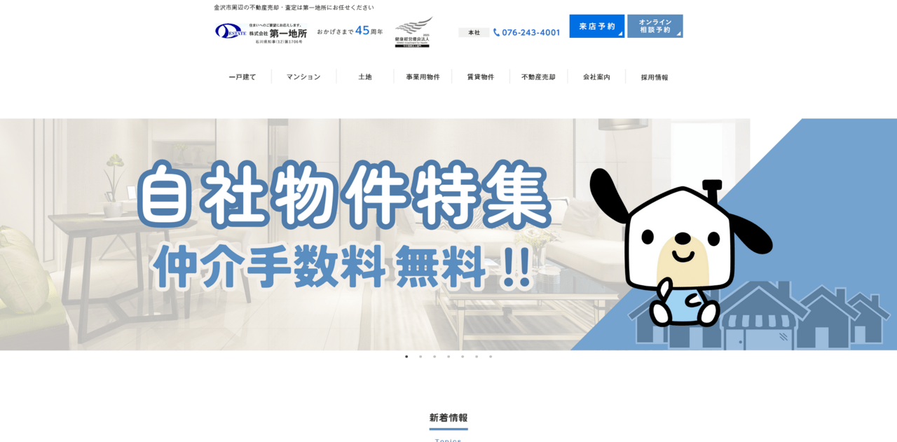 株式会社第一地所は、金沢市で40年以上の歴史を持つ地域密着型の不動産会社で、年間500件以上の売却実績がある信頼の厚い企業です。地元の不動産市場に詳しく、自社サイトおよび大手ポータルサイトを活用した広範囲な情報発信により、スピーディかつ確実な売却をサポートします。相続した実家や空き家、農地、訳あり物件を含む幅広い不動産に対応可能で、リフォーム再販サポートも提供しているため、老朽化物件の売却にも強みがあります。スタッフは不動産業歴10年以上が多く、迅速な対応と提案力で早期の現金化を目指せる点が評価されています。