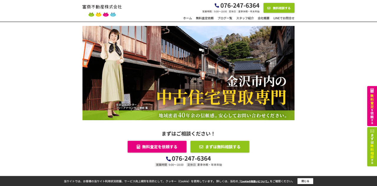 富商不動産株式会社は、金沢市を中心に40年以上の地域密着実績を持つ不動産会社です。徹底した適正査定に基づく正確な市場調査と物件調査で、売主に最大限の利益をもたらすことを約束しています。テレビCMや新聞広告をはじめ、多彩なメディア広告を活用し、幅広い買主層をカバーする販売力が強みです。買取対応では、相続物件や空き家、農地など多様な不動産の相談に応じ、最短1週間での買取決済も可能。売主の希望やペースに柔軟に対応する姿勢も評価されています。