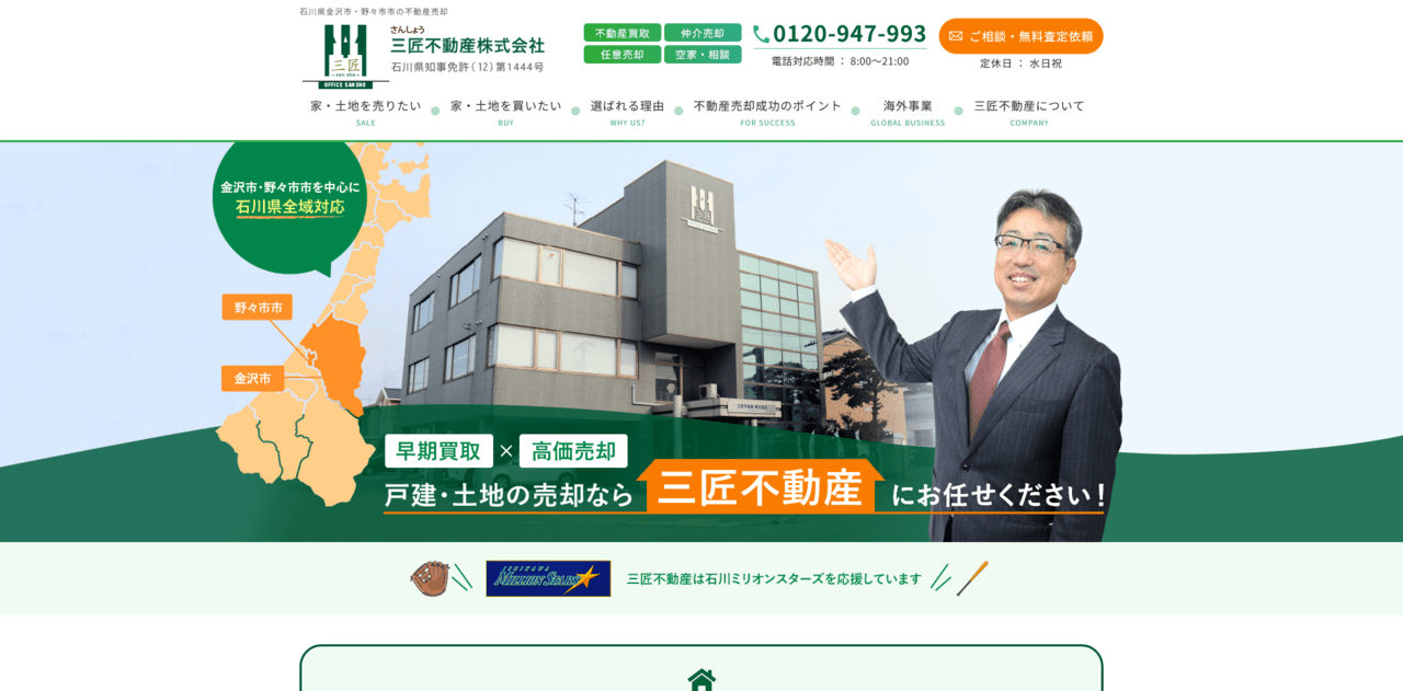 三匠不動産株式会社は金沢市を拠点に地域密着で不動産売買を行い、多様な不動産ニーズに応える実績豊富な会社です。相続物件や空き家、農地を含む幅広い物件の買取に対応し、迅速な査定と現金化を心がけています。スタッフは不動産の法律や税務にも精通し、売主の事情に寄り添った最適な提案を提供。地元のネットワークを活かした買主発掘力も高く、別途解体やリフォームの手配もスムーズです。秘密厳守や対面不要の非接触対応にも対応しており、安心して相談できる環境を整えています。